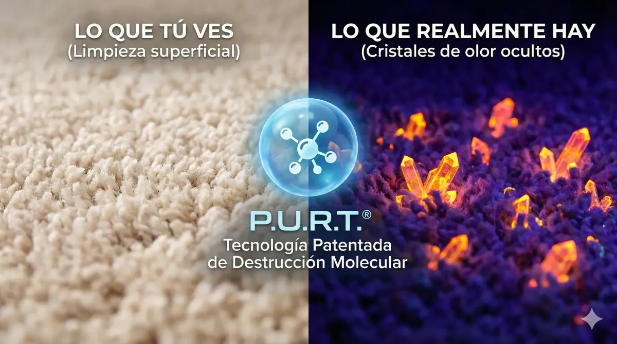 Lo que tú no ves, tus invitados sí lo huelen. La orina de mascota se filtra en las fibras y se convierte en cristales de ácido úrico que atrapan el mal olor. Nuestro sistema patentado P.U.R.T.® utiliza biotecnología para desintegrar esos cristales a nivel molecular. Si no hay cristales, no hay olor. Garantizado.